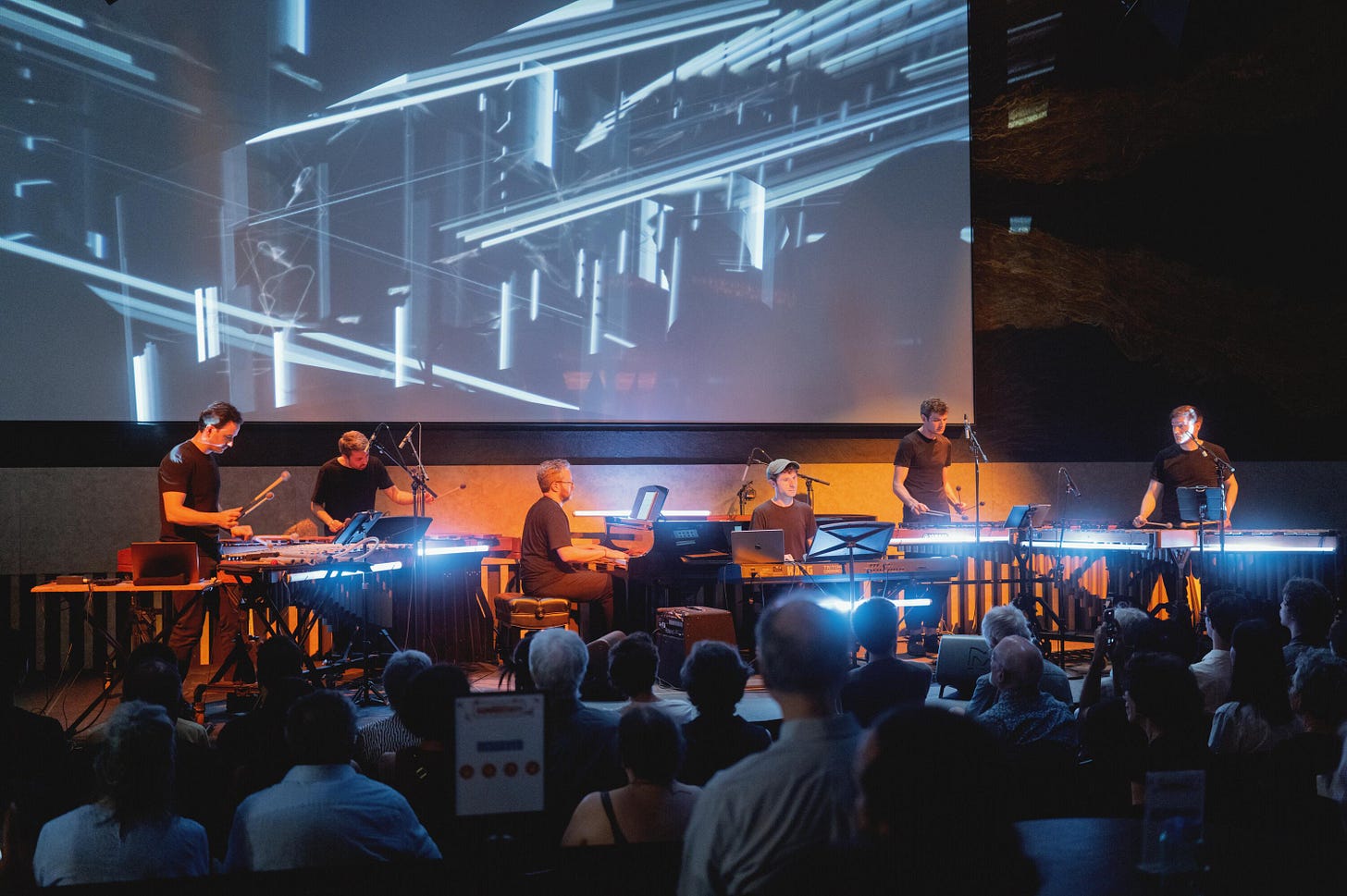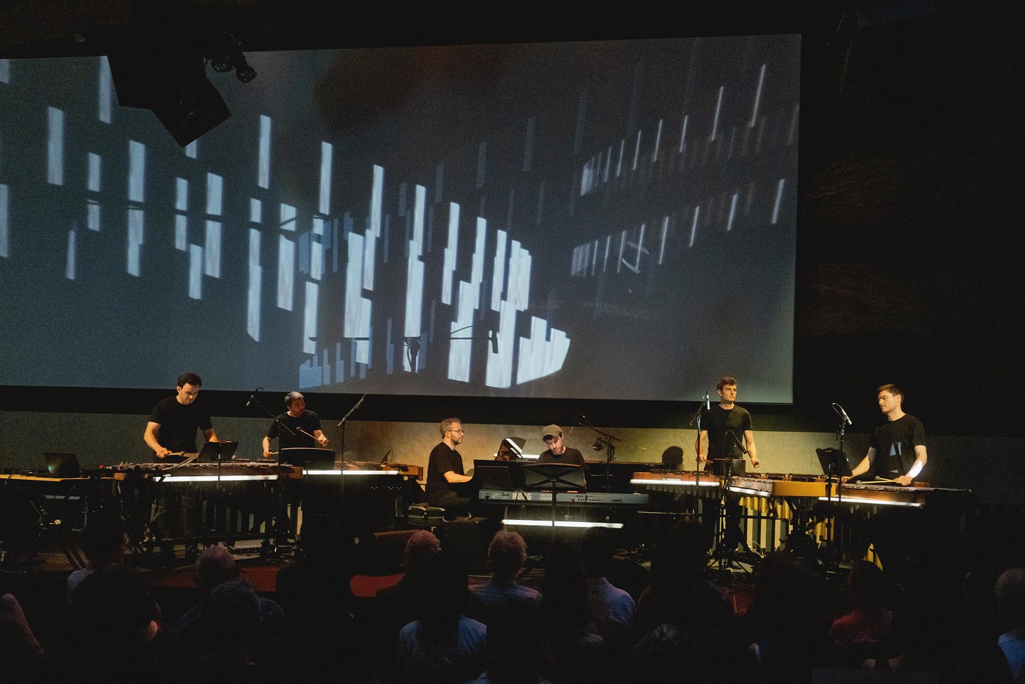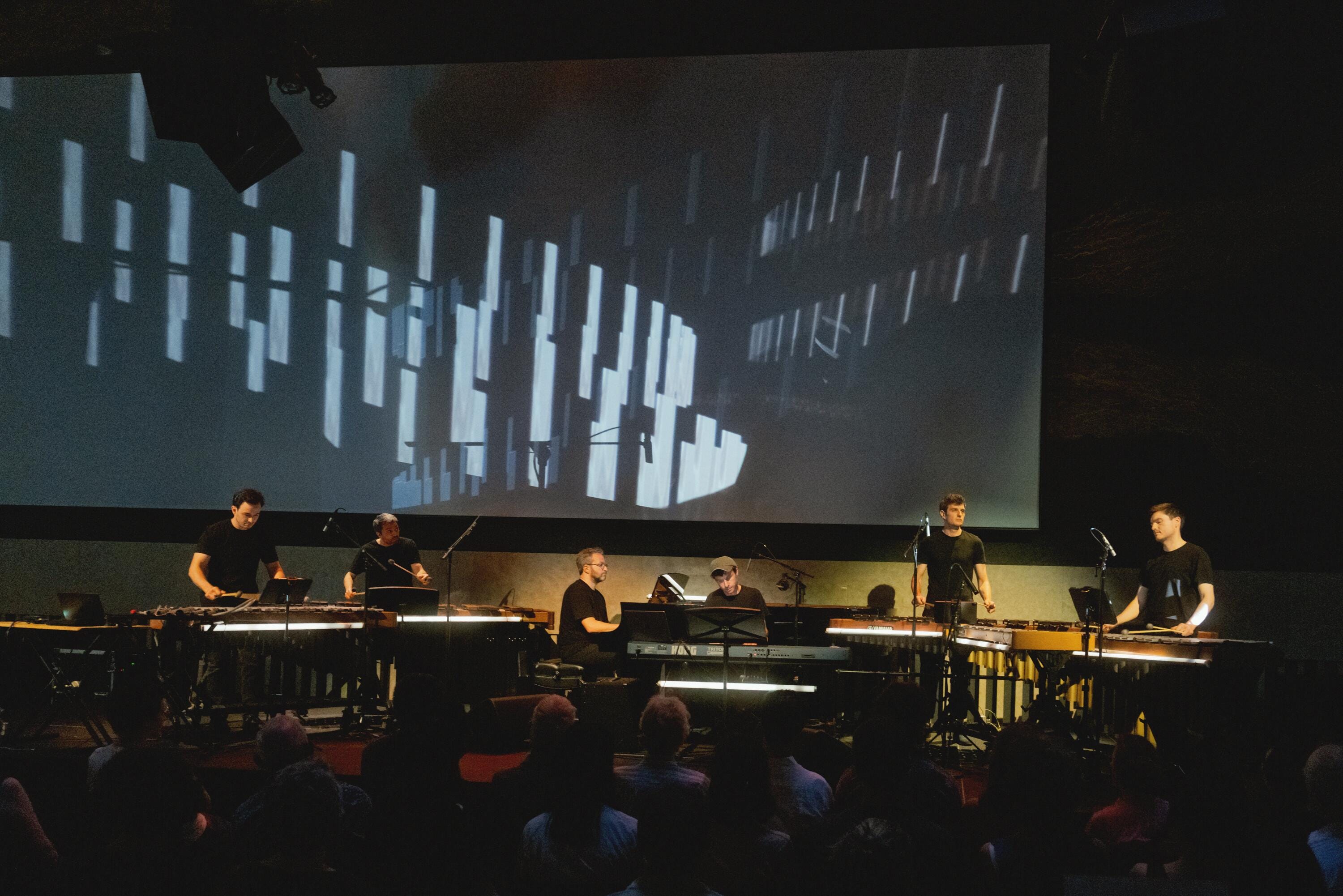 The instrumentation for Canto is deliberately left open; the score says merely, “for keyboard instruments.” On this occasion, the members of the quartet Sandbox Percussion, playing two marimbas and two vibraphones, were joined by (from the American Modern Opera Company) pianist Conor Hanick and Matthew Aucoin on synthesizer. The length of a performance is also variable, because the piece consists of 106 small fragments of a few measures, each of which can be repeated as many times as the performers wish. Sunday’s performance clocked in at about 75 minutes; others can reportedly run several hours.
