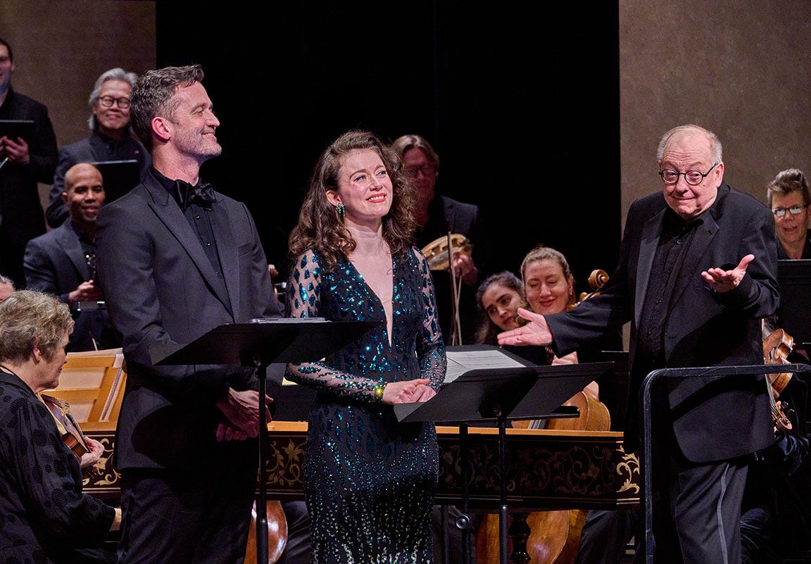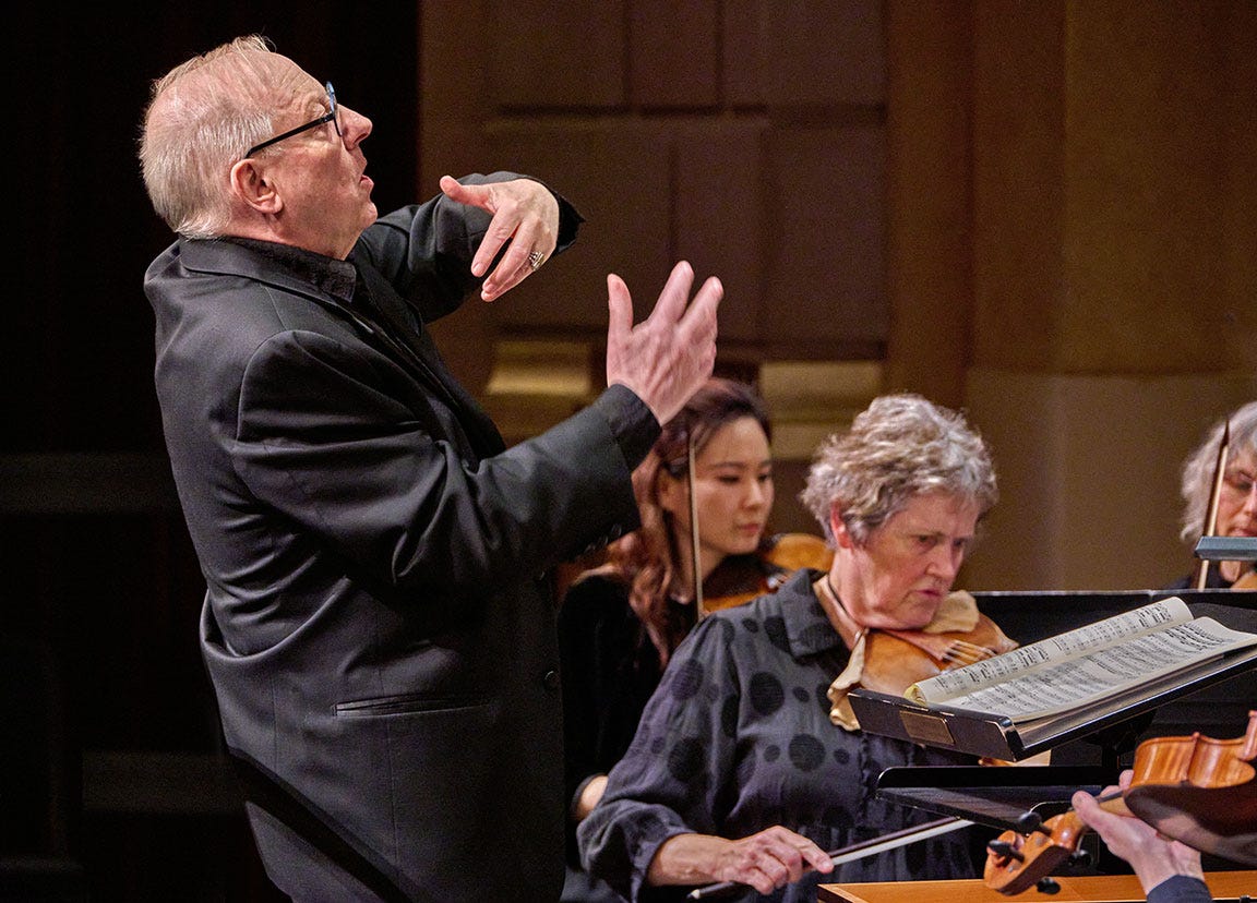 So when McGegan returned on Friday night to conduct the orchestra he now serves as Music Director Emeritus, the headline news was “McGegan conducts Handel!” The first half of the program was devoted to the composer’s 1707 psalm setting Dixit Dominus, and lord, it was sublime. In one movement after another — solos, choruses, small groups of vocalists — McGegan shaped the music with his characteristic blend of translucency and fleetness. There were vibrant solo contributions from soprano Nola Richardson and tenor Aaron Sheehan, and the Philharmonia Chorale, ably led by Valérie Sainte-Agathe, sounded forceful and well-blended, especially in the powerful final “Gloria.”