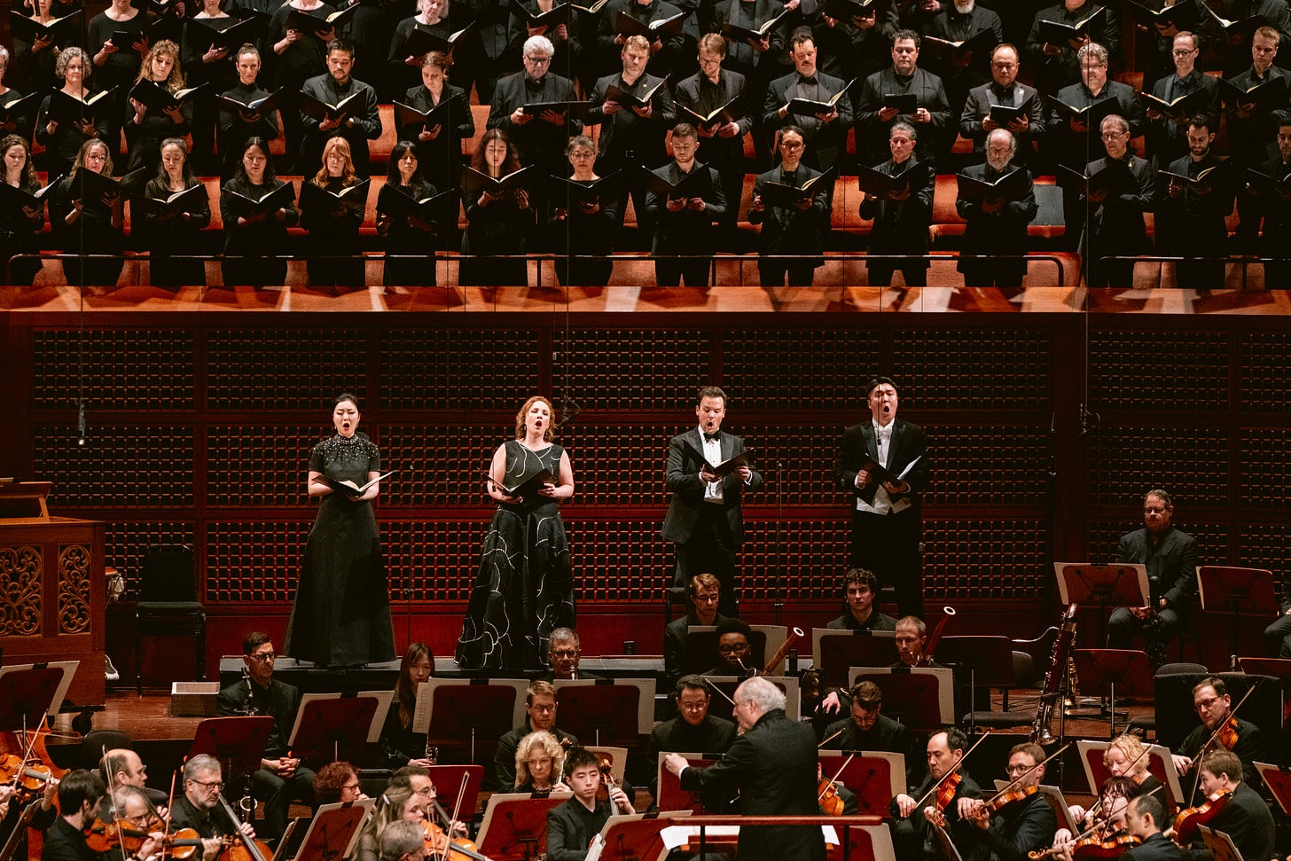 I’m not persuaded that either the overall framing or the individual additions contributed much of importance to the program, but the musical execution was so magnificent that it hardly mattered. The vocal soloists, led by soprano Ying Fang and mezzo-soprano Sasha Cooke, brought insight and sensitivity to their individual assignments. The Chorus sang with gusto and tenderness. The orchestra brought vigor and heft to even the most translucent passages, and trombonist Chase Waterbury rang out with oracular clarity in the Tuba mirum.